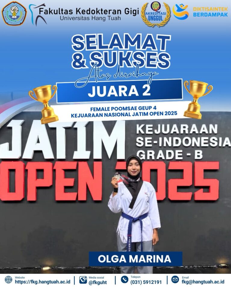 Surabaya kembali berpendar oleh kabar membanggakan. Fakultas Kedokteran Gigi Universitas Hang Tuah (FKG UHT) menambahkan satu lagi ukiran kemenangan pada catatan prestasinya. Dua mahasiswi berbakat tampil memukau di ajang bergengsi Kejuaraan Nasional Jatim Open 2025, membawa pulang medali dan tepuk hormat dari banyak pihak.